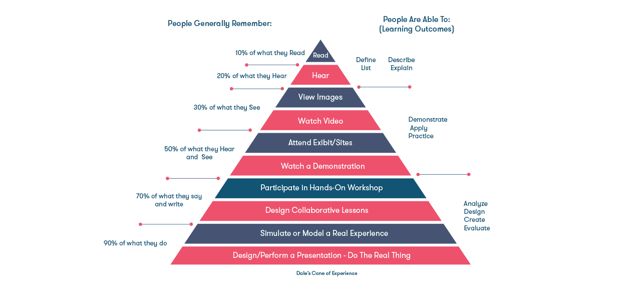 Edgar Dale in the 1960s created a well-known model to explain the effects of different learning styles, which suggests that experiential learning is far more powerful than reading a book or listening to a lecture.